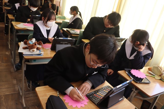 立志の会の掲示物として、感謝のメッセージを作成しています。日ごろお世話になっている人に向けて、自分の思いを改めて言葉に書き表していました。