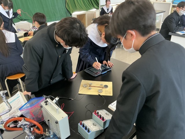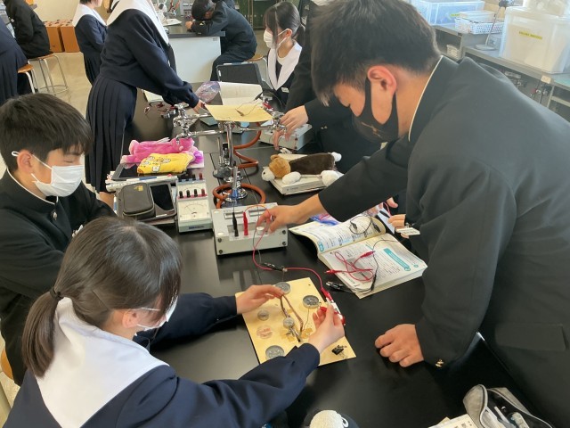 今日はコイルに流れる電流がつくる磁界の実験でした。