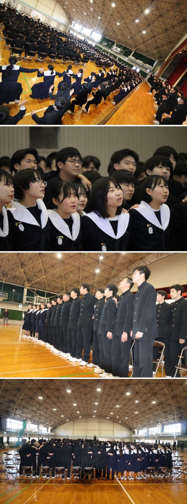 解団式の後、全校で3年生にエールを届ける、卒業生を送る会が開かれました。各部活動からのメッセージや、先生方からの励ましのメッセージ、在校生からは三・三・七拍子で激励するなど心温まるものにあふれていました。卒業生からは、最後に合唱をする中で、肩を組みながら仲間たちと思いを馳せる姿がありました。