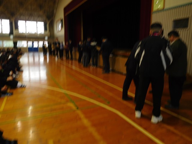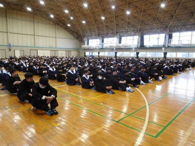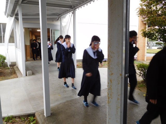 第1理科室からの出火により、本日は、雨のため体育館に全校生徒は避難する訓練を行いました。