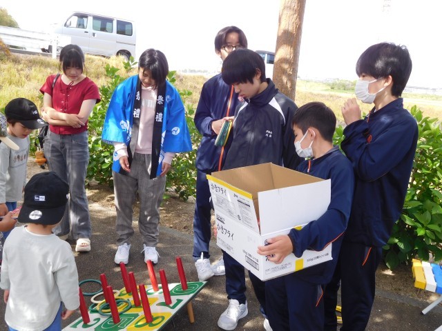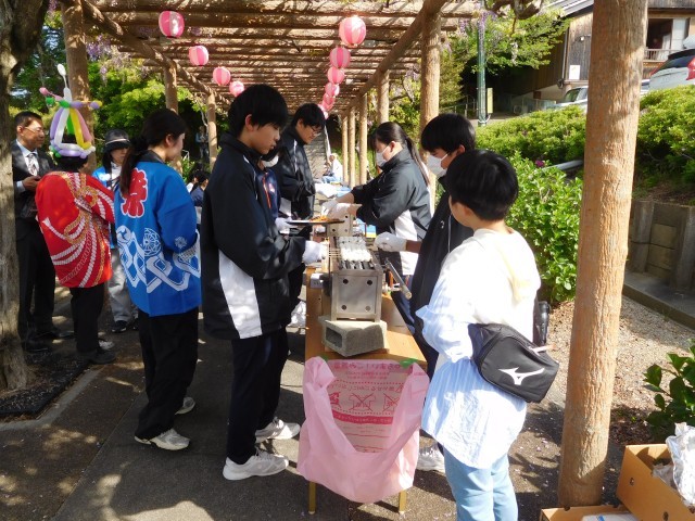 当日は、団子を焼く、団子を配る、お茶を配る、豆つかみ、輪投げの担当を決めて行いました。