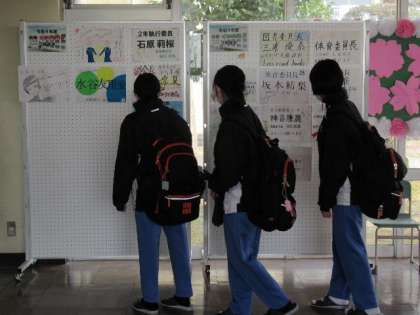 昇降口に大きく張り出された令和4年度前期生徒会役員選挙に向けての公約用紙。朝から立ち止まって眺める姿がありました。立候補者それぞれが、明祥中をよりよい学校にしていこうという思いをもっています。選挙は、今週木曜日。自分の一票を託す人をじっくり考えていきましょう。