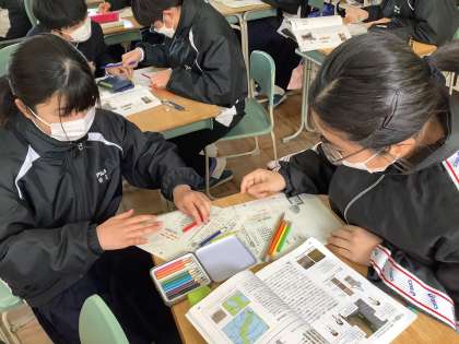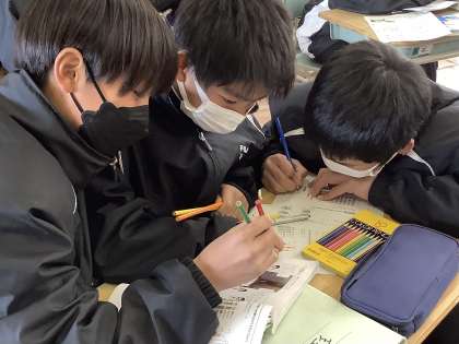 理科の授業で地層の特徴について学びました。教科書の例題から地層の色を塗って、地層が地中の中でどうなっているのかを考えていました。