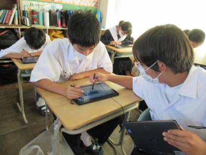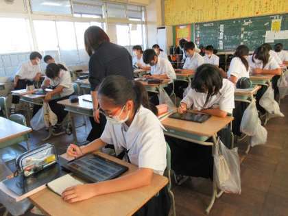 プレゼンテーションソフトを使って、海外旅行を提案しようと取り組んでいます。SEさんの手を借りながらも、どんどん操作に慣れていきました。学習した英語表現を使ってどのような海外旅行を提案してくれるのか、わくわくしてきます。