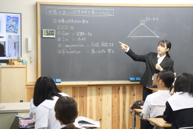 教育実習生による保健体育の研究授業が行われました。外傷の応急手当の実践として、三角巾を使ったりタオルや教科書などの身近なものを使ったりして、いざという時の処置の仕方を学びました。