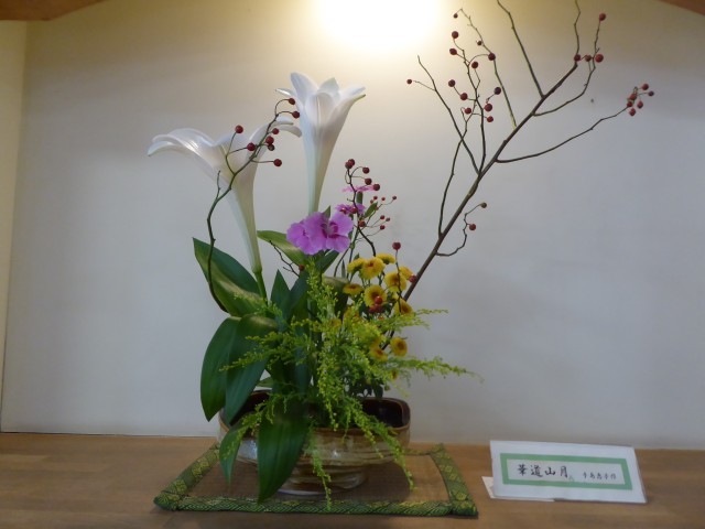 花材:バラの実、鉄砲百合、なでしこカーネーション、小菊、ソリダコ
