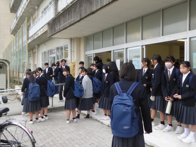 団ごとに日程を決め、昇降口であいさつ運動を行っています。生徒の爽やかな声が、早朝の学校に響いています。