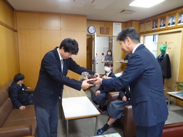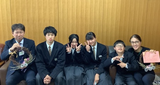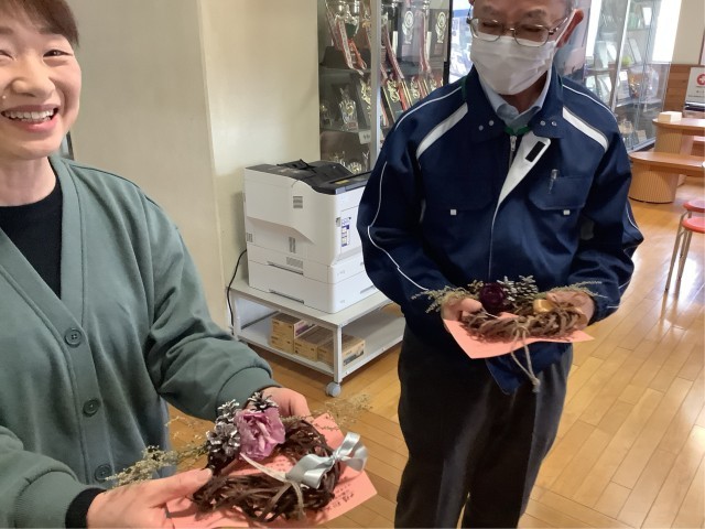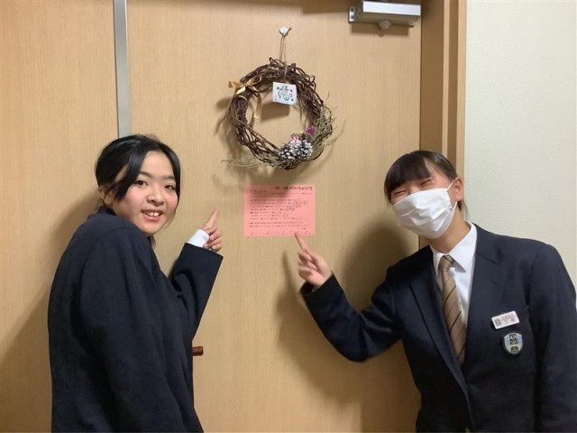 11・12組の生徒が、サツマイモのツルを使ってリースを制作し、お世話になった先生方に届けました。作業の授業で制作したマーブリングの美しいメッセージカードも添えられていて、受け取った先生方の心が温かくなりました。早速、校長先生が校長室の扉に飾られました。心のこもった贈り物をありがとう。