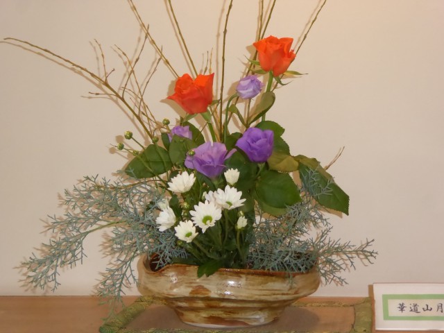 花材:こうりやなぎ、バラ、小菊、コニーファ、トルコキキョウ