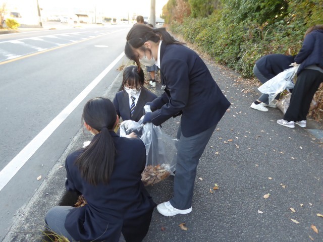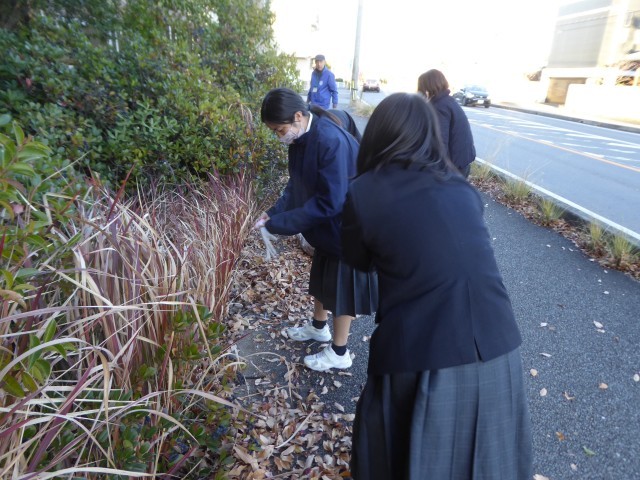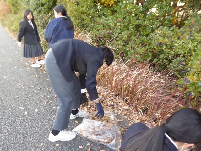 学校の敷地南側の歩道の落ち葉掃除をしました。部活動の活動時間が短いので少しずつ片付けています。