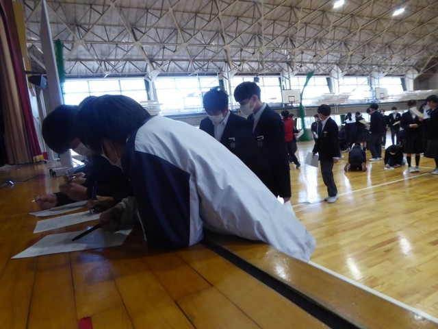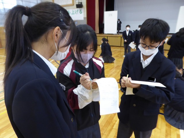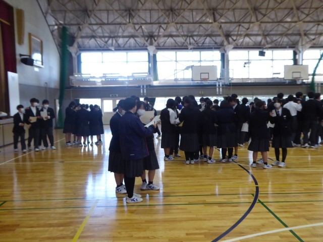昼放課に生徒会作成のビンゴカードを使って、体育館で団ごとにビンゴを実施しています。今日は青団でした。インフルエンザ対策のため、マスク着用で実施。冬の寒さを感じる体育館でしたが、生徒の交流の輪が広がって温かい気持ちになりました。