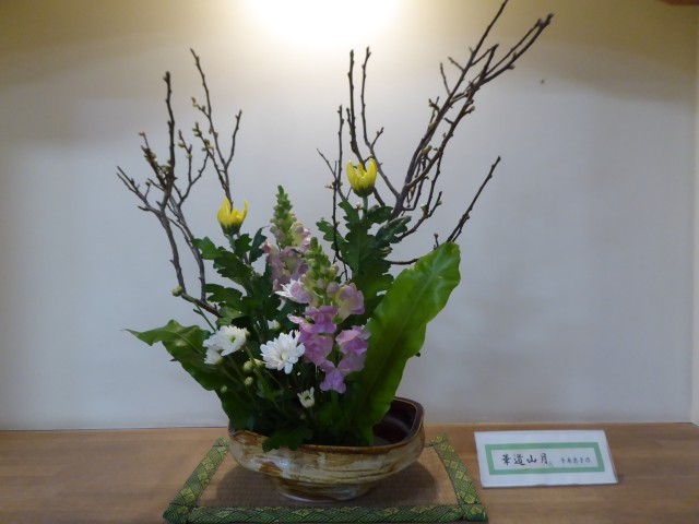 花材:梅、金魚草、菊、スプレー菊、タニワタリ