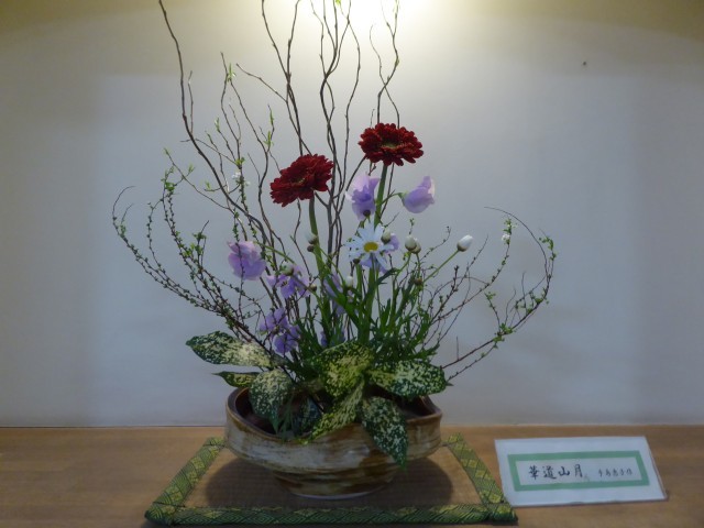 花材:雲竜柳、ガーベラ、スイトピー、マーガレット、雪柳、ゴート