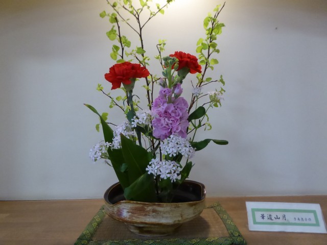 花材:くわでまり、ストック、カーネーション、サクラコマチ、ハラン