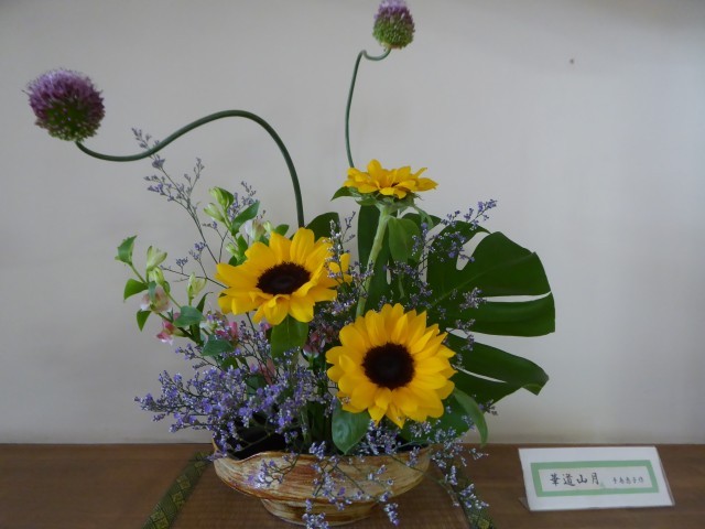 花材:丹頂アリウム、アリストメリア、ひまわり、ハイブリットスターチス、モンステラ