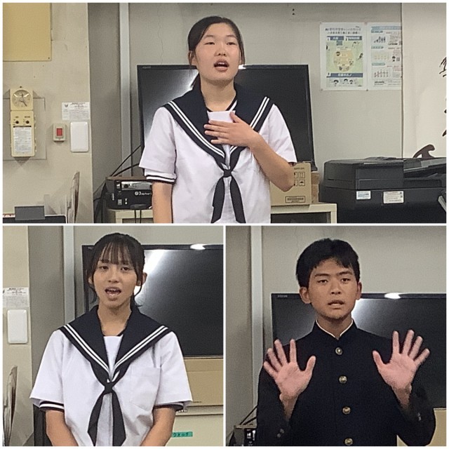 英語プレゼンテーションコンテスト! 公開日 2025/10/22 更新日 2025/10/22 校内の様子 今日は英語プレゼンテーションコンテスト本番です。朝の会でも各学級で発表し、話し方を磨いてきましたが、会場に出かける前に職員室でも成果を披露してくれました。生き生きとした表情で、流ちょうに思いを英語で伝えていました。本番も頑張ってくださいね! いいね(1)