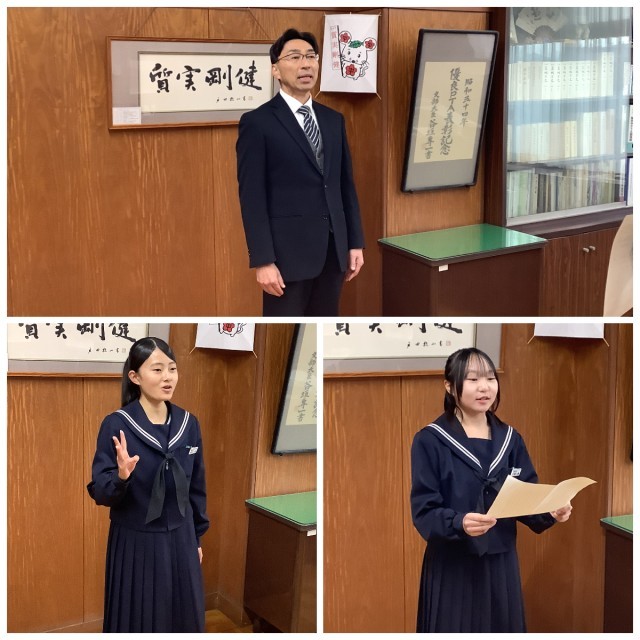 校長先生からの言葉があり、その言葉に応えるように、生徒会長と生徒代表が自身の2学期の頑張りや学びを語りました。