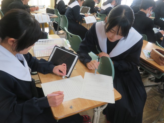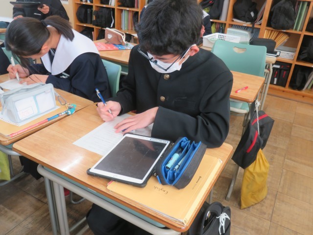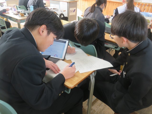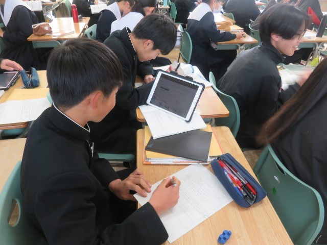 【2年生】英語の授業~アンケートの結果をもとにレポートを書こう! 公開日 2026/01/21 更新日 2026/01/21 校内の様子 本日の英語の授業では、英語でレポートを作成しました。生徒たちは、班または個人で独自のアンケートを作り、その結果をもとに比較級や最上級の表現を用いて英作文に取り組みました。アンケート結果をどのように相手に伝えるかを考えながら、試行錯誤しつつ意欲的に学習する姿が見られました。 +1 いいね(0)