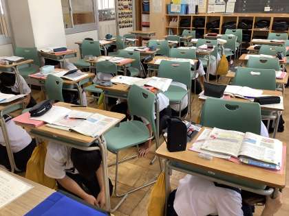授業中、緊急のアラームが流れました。緊急地震速報対応訓練です。