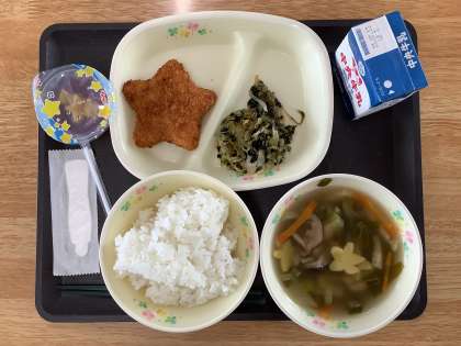 今日の給食は、七夕献立でした。星の形の食べ物がたくさんありました。みんなでおいしくたくさん食べました。IJ組は、残菜が少ないです。なぜなら、みんなでたくさん食べるからです。