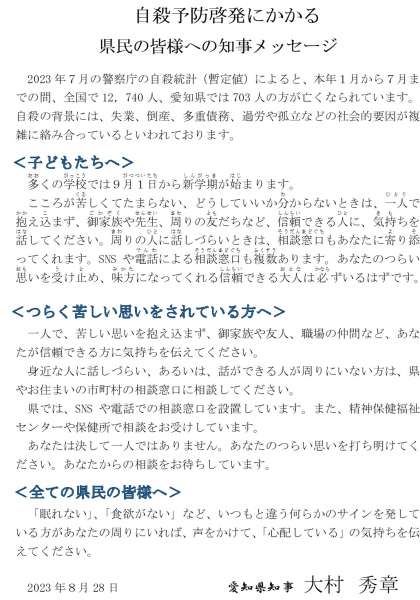 まもなく新学期が始まります。このことを踏まえ、愛知県知事から県内全ての学校の児童生徒等及び県民に向けて、次のメッセージが発信されました。