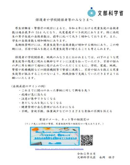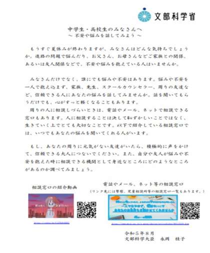 生徒、保護者の皆さんへの文部科学大臣からのメッセージをお伝えします。