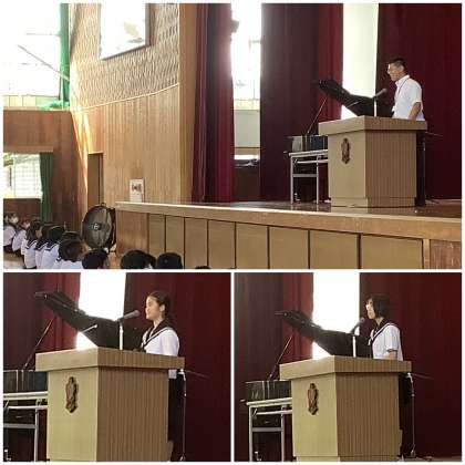 その後、世界陸上で転倒したオランダ選手の言葉「望んでいたことではないけど、こういったことは起こるもの」「人生は良いことばかりじゃない。山あれば谷あり。だから人生は美しい」を紹介し、得意でないかもしれないが2学期の行事等で「前へ」進んでほしいと期待を話されました。