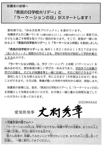 愛知県では、「『休み方改革』プロジェクト」を進めています。このプロジェクトの内、「県民の日学校ホリデー」と「ラーケーションの日」がスタートするに当たり、知事からメッセージが発出されました。