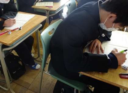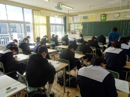本日、1,2年生は実力テストを、3年生は学年末テスト(2日目)を行いました。どのクラスの生徒も、日頃の学習の成果を出せるよう、一生懸命テストに取り組んでいました。特に3年生にとっては、中学最後の定期テストということもあり、いつも以上に集中してテストに取り組んでいるように感じました。