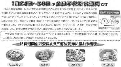 1月24日〜30日は、全国学校給食週間になります。この期間、安城市や愛知県でとれた地域の産物や郷土料理などが給食に出されます。給食をおいしくいただきながら、給食の意義や役割についても考える機会としてほしいです。