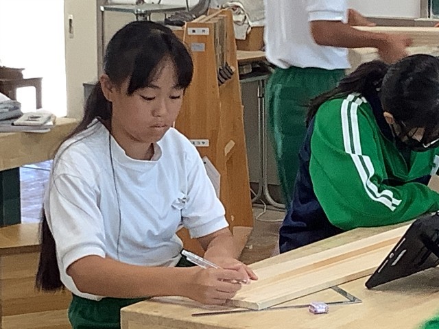 1年8組では,技術科で木材加工で本棚などをつくっています。