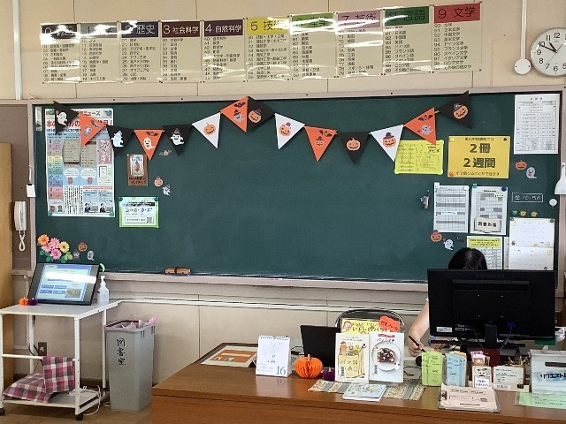 ボランティアの皆さんの協力により,図書室はハロウィンの装いにつつまれています。
