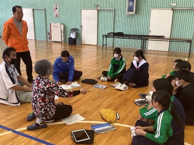 後半は,生徒たちが住んでいる地区ごとに分かれ,各町内の自主防災会の皆さんよりお話を聞きました。