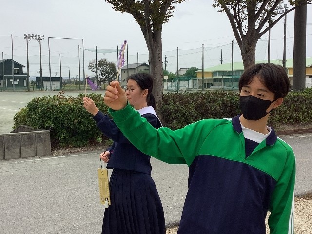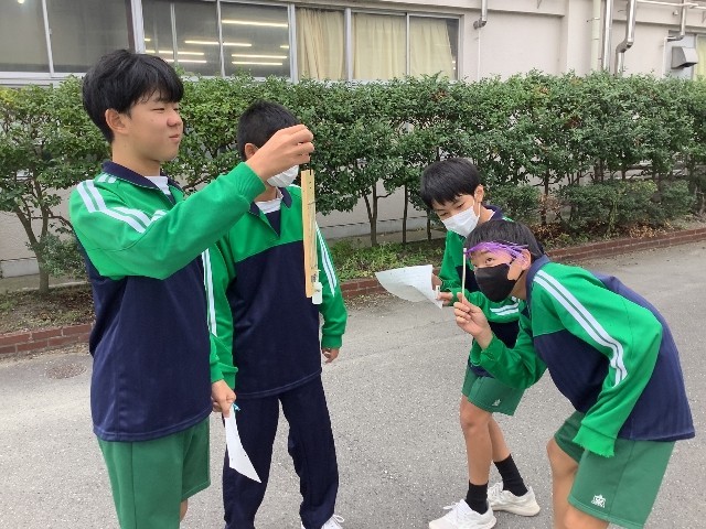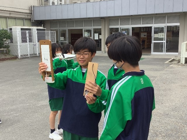 2年理科 乾球と湿球をはかり,風の強さなどをはかり,湿度などを知らべています。