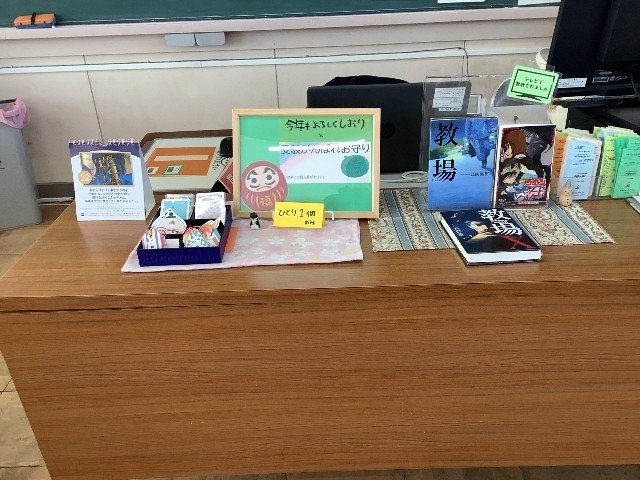 今月の図書室は,恒例のがんばる受験生グッズ,
