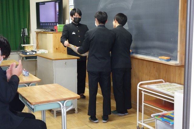 1、2年生が作成したメッセージを3年生の先輩へ贈呈しました。