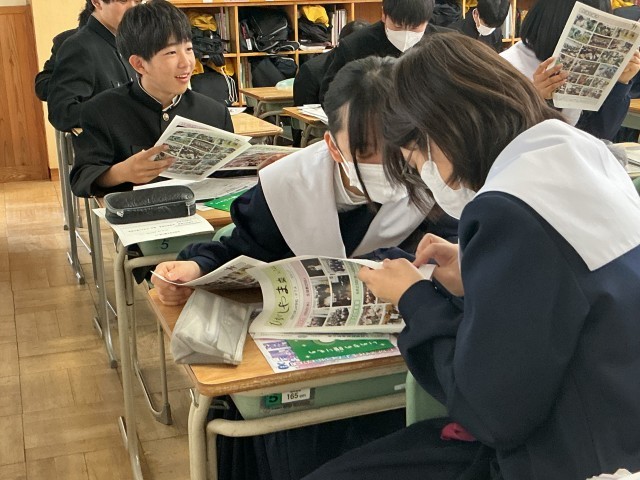 本年度を振り返る写真いっぱいの新聞に,暫時生徒も夢中です。