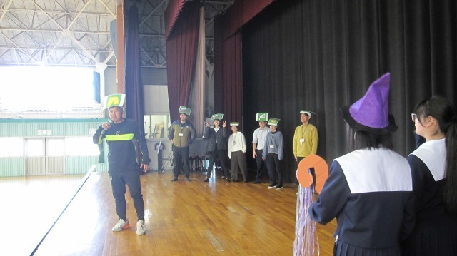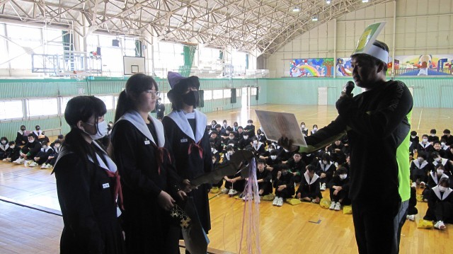 修了式を明日に控え、2年生は4時間目に学年集会を行いました。春休みの生活や学習についての話に続いて、それぞれの学級代表と先生方が1年を振り返っての話をしました。冒頭は寸劇も交えて楽しい会となりました。
