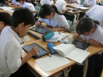 1年生の社会科の授業では、タブレットを活用し、アジアの国々の