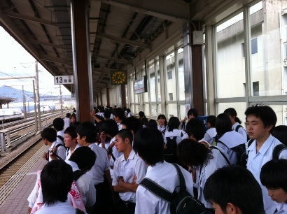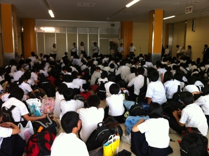 昼食後、出発前に学年写真を撮り(写真1枚目)、その後、バスに乗って新富士駅に到着しました(写真2枚目・3枚目)。生徒たちはちょっと疲れた様子です。