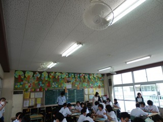 昨日まで、涼しく心地よい天候の日が多くありましたが、今日は雲が晴れるとともにしだいに暑くなってきました。本校では、原則室温が28度を超えると扇風機を使ってもよいことにしています。ある教室では「弱」の設定で扇風機が回っていましたが、十分心地よい風が届いていました(「強」だと机上のプリントも飛ぶぐらいです)。