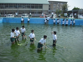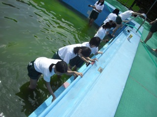 6月28日のプール開きに向けて、プール清掃が進んでいます。この日は2年生の生徒たちがプールの壁面などをきれいにしてくれました。間もなく、水の季節を迎えます。