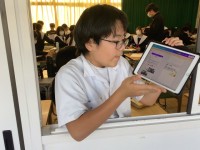 1年8組の総合では,ペットボトルキャップを加工してキーホルダーづくりをしています。不要なものを価値あるものにかえていく,そんな取り組みをしています。