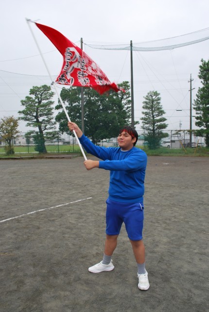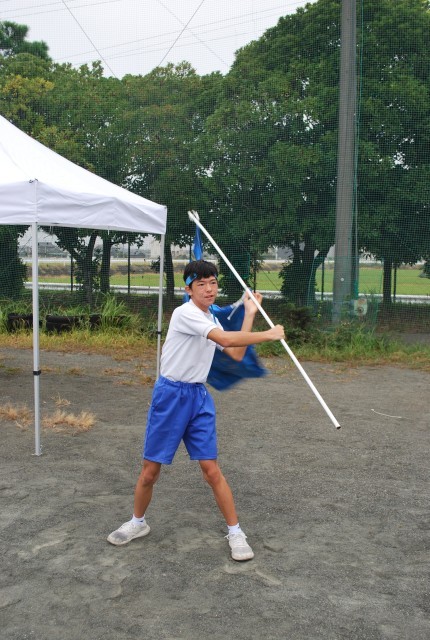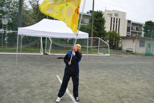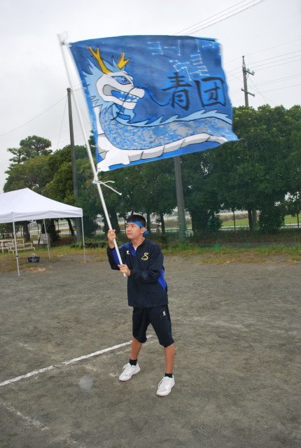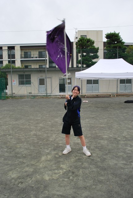トラックで全員リレーを行っている最中、応援席の後ろでは各団で制作した団旗を振り、応援し続けている生徒がいました。