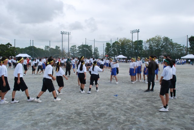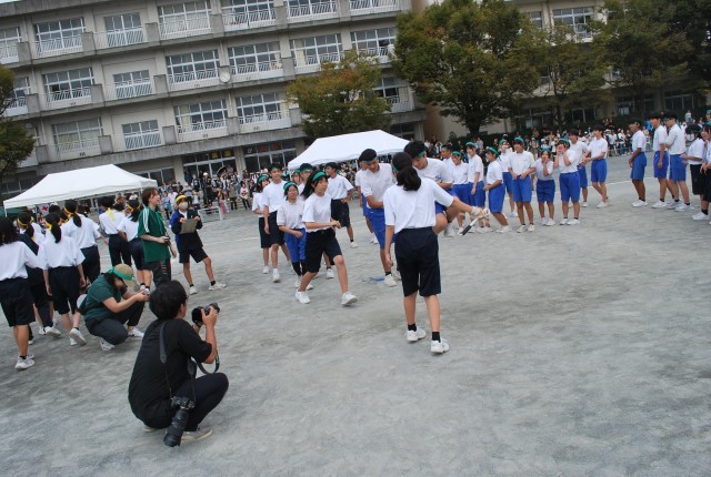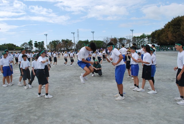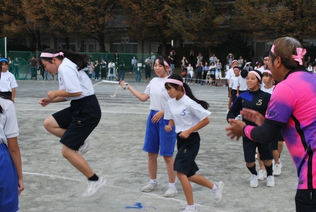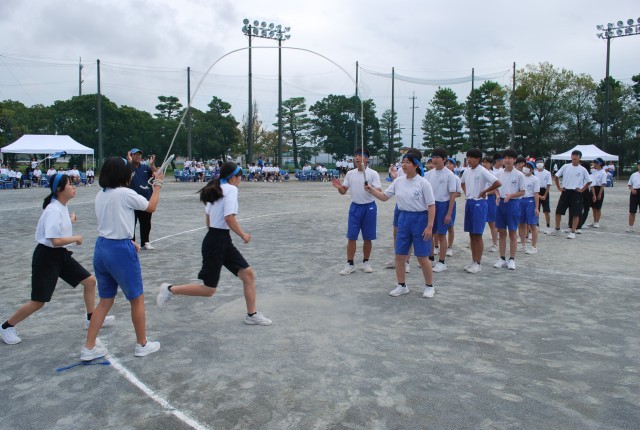 第3競技は、「長縄」です。体が大きい中学生にとっては、ちょっと難しさのある競技です。でも、手を叩いたり、声をかけ合ったりして、みんなの力で跳び続けました。