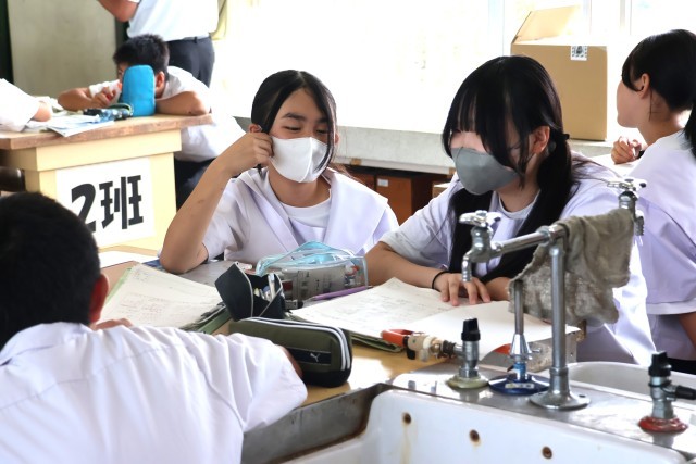 先日は1年生の理科でそういった授業が行われました。生徒のみなさんが風呂釜洗浄剤を水に溶かしたときに発生する気体について熱心に考えました。班のみんなと互いの考えを伝えながら熱心に考える姿が見られました。