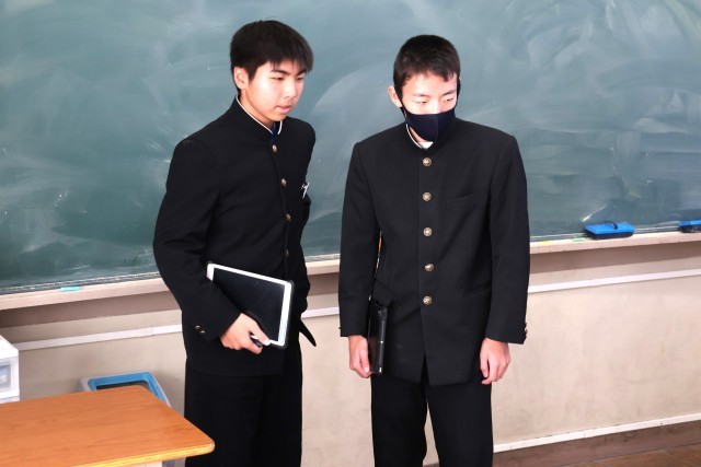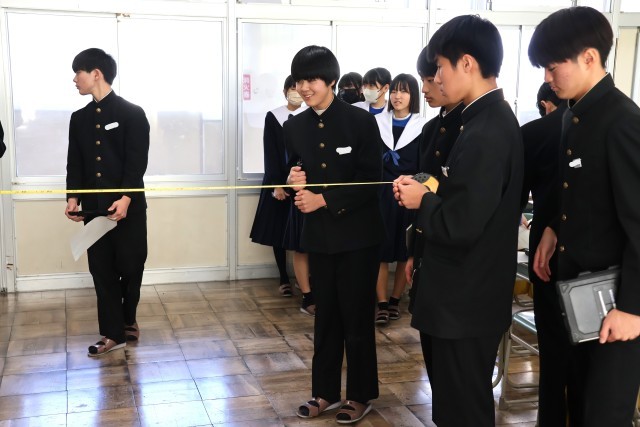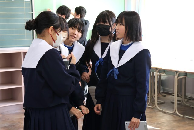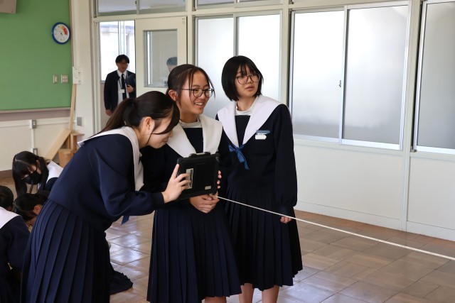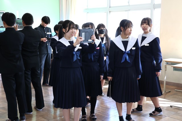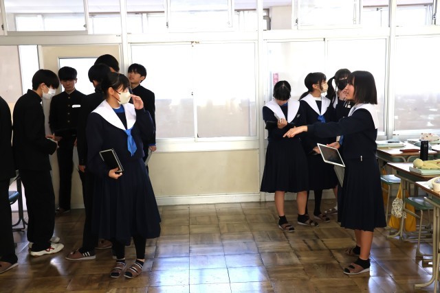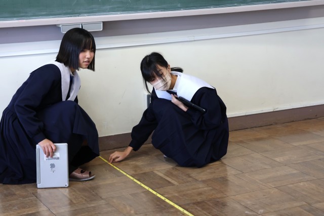 本日の5時間目に、3年生で数学科の授業公開がありました。教室内での写真撮影を問題場面として、どこから撮影すればよいのかを考えました。前時までに個人で考えたことをもとに、級友とともに互いの考えを伝え合いながら考えを広げました。実際にタブレットで何回も撮影したり、メジャーや分度器を使って測定したりと、様々な方法で熱心に考えました。みんなであれこれ考えを出しながら考え、納得のいく方法を見つけ出す、そんな楽しさを感じている3年生のみなさんがすごいなと思いました。
