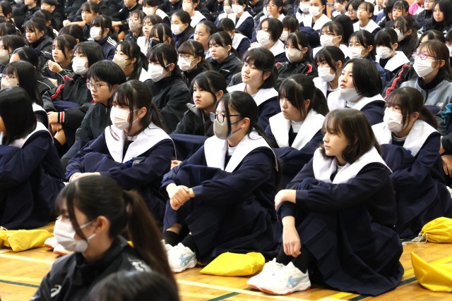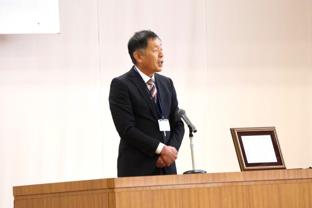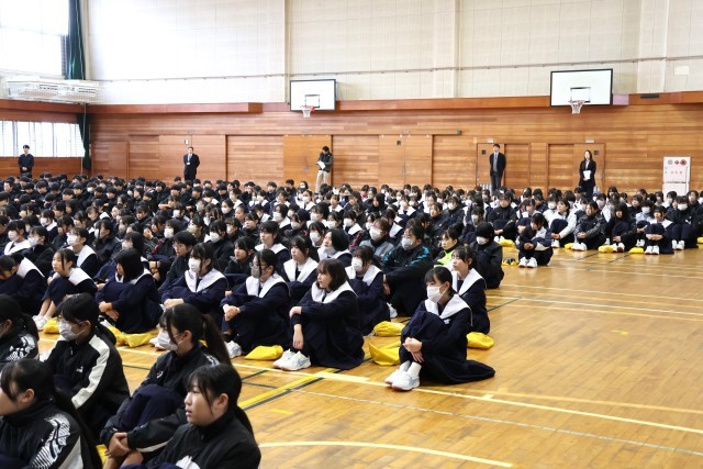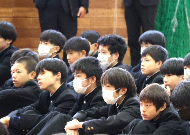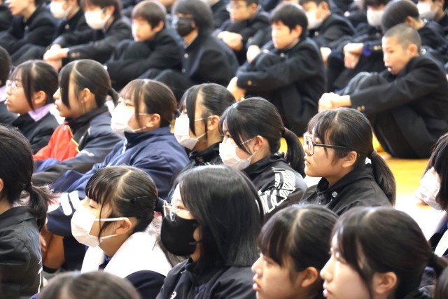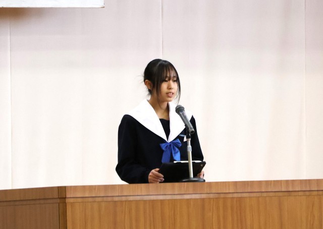 2名の代表生徒の話では、生徒会代表生徒からは「2学期の体育祭・文化祭の成果を振り返りながら、3学期はさらに『イイネ』と『いいね』があふれる学校にしていきたい」、3年生代表生徒からは「自身が2学期に目標としていた、体育祭での優勝に向けた応援リーダーとしての取り組み、合唱コンクール最優秀に向けた指揮者としての取り組み、剣道2段取得に向けた取り組み、その一つ一つが今の自分の自信に繋がってきている」ことについて、全校生徒に向けて堂々と伝えてくれました。