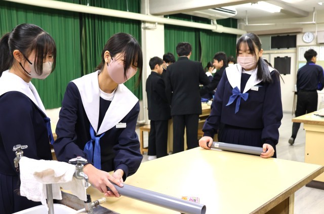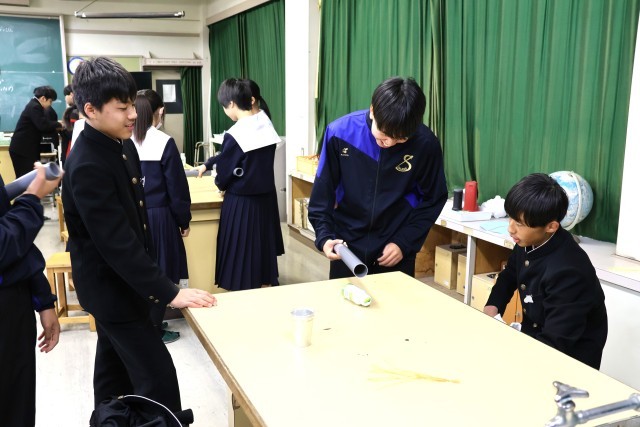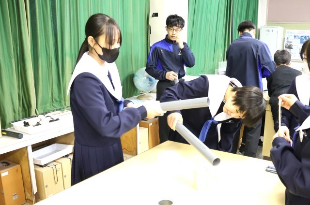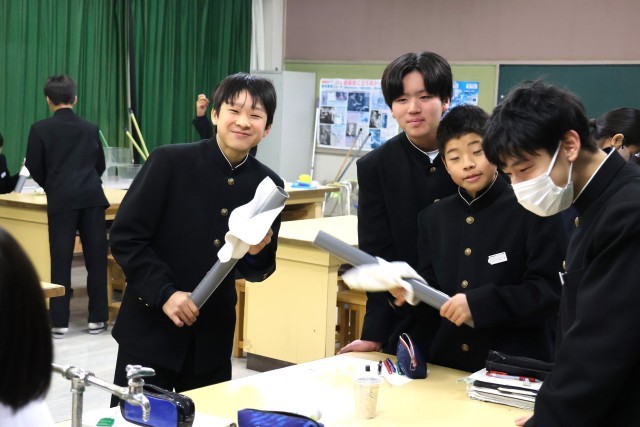 2年生理科では「静電気」の学習をしていました。授業を参観したときには、塩ビ管を服でこすり静電気を起こしていました。それぞれのグループで楽しみながら実験に取り組んでいる様子が見られ、授業中のことではありますが微笑ましい気持ちになりました。この実験がこれからの学習にどう生きてくるのか、楽しみですね。