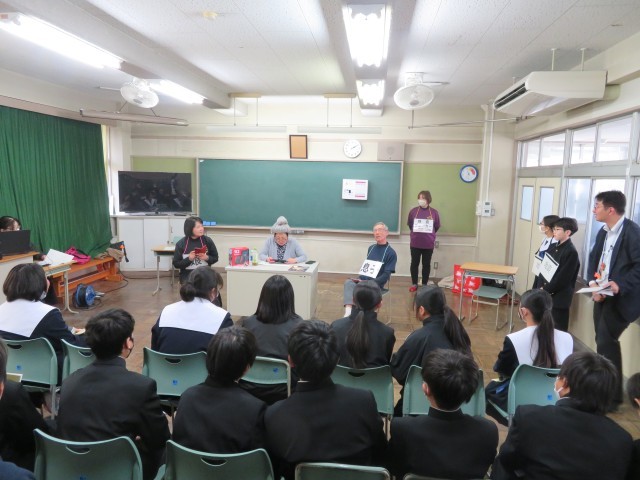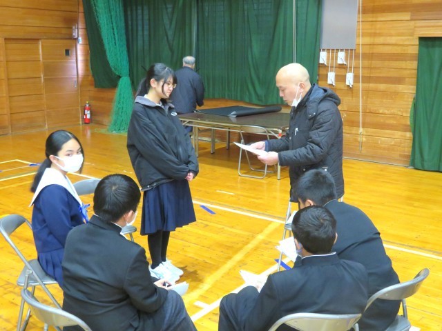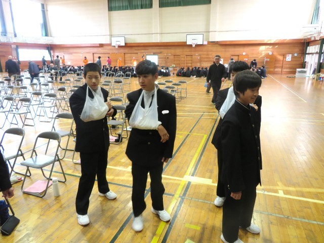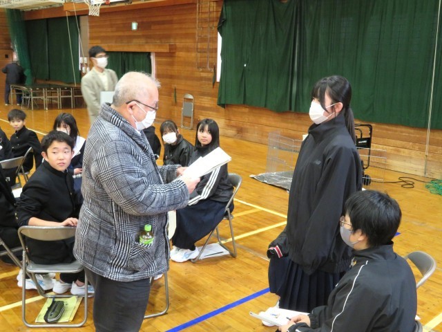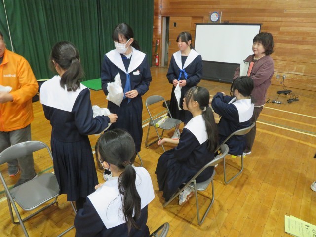 第2部の体験を終えると、町別に分かれて「地区別の座談会」を行いました。座談会の中では、地域の方々や講師のホップ、社会福祉協議会、危機管理課の方なども班に入っていただき、もし地震が起きたらどんな被害があるか、どんな人たちが困るのか、そんな中で中学生がどんなことができるのかを考えました。また、会の最後には、各町内会長さんから修了証を渡していただきました。